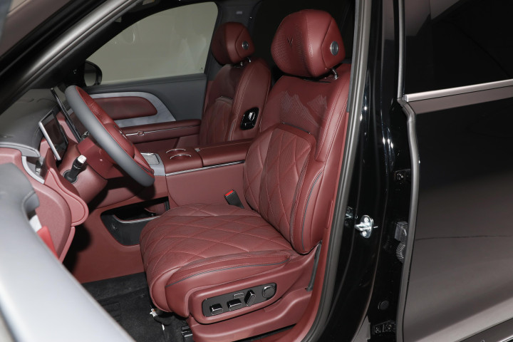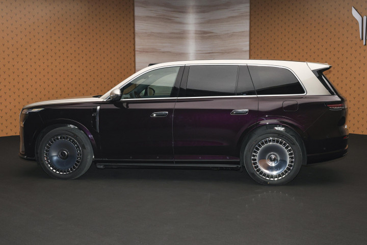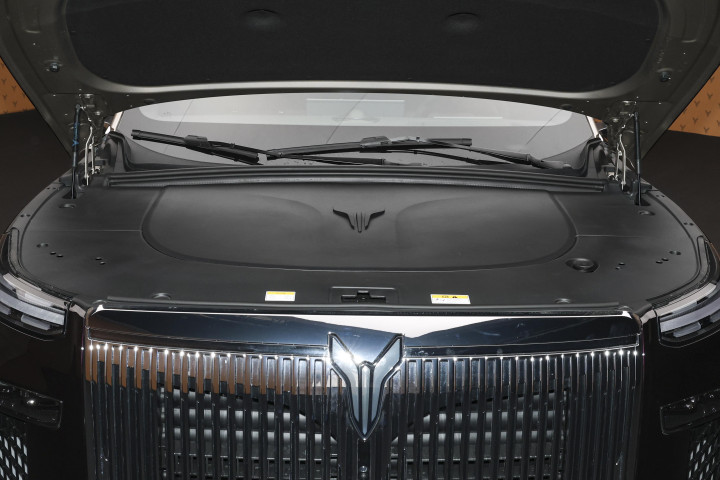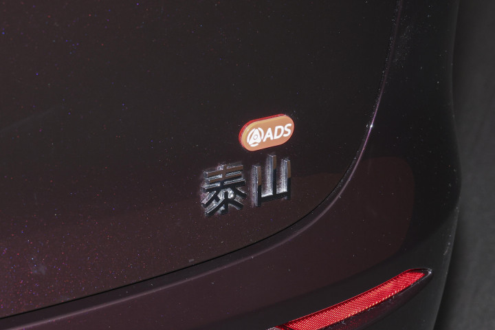 走到车身侧面,会发现车门把手内嵌了 24 颗 LED 灯珠,在夜晚靠近车辆时,这些灯珠会有点阵微光逐渐亮起,营造出类似星河流转的迎宾效果。半隐藏式的门把手与电动侧踏板相互配合,当车主靠近车辆时,侧踏板会自动弹出,再加上投射到地面的光毯,为上下车增添了一些仪式感。车尾设计相对简洁,贯穿式的 LED 尾灯内部采用点阵式光源,其设计理念被称为 “山海倒影”,上方的线条勾勒出群山的形状,下方则映射出水波的纹理,与车头设计形成了呼应。整体而言,岚图泰山的外观设计试图在传统高端车型的大气风格与现代新能源车型的科技感之间找到平衡,并且融入了具有东方特色的美学元素。